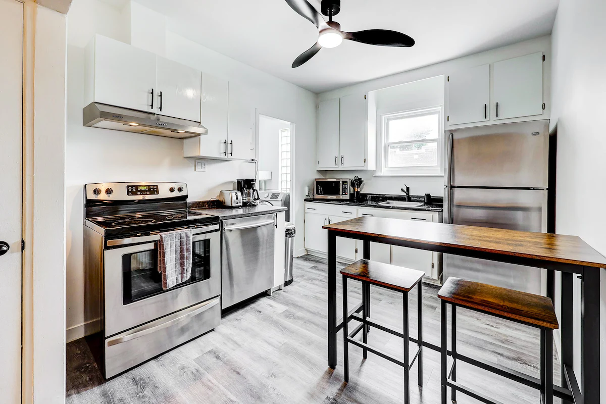 – A fully equipped kitchen with an oven, refrigerator, microwave, dishwasher, coffee maker, and all the necessary cookware;